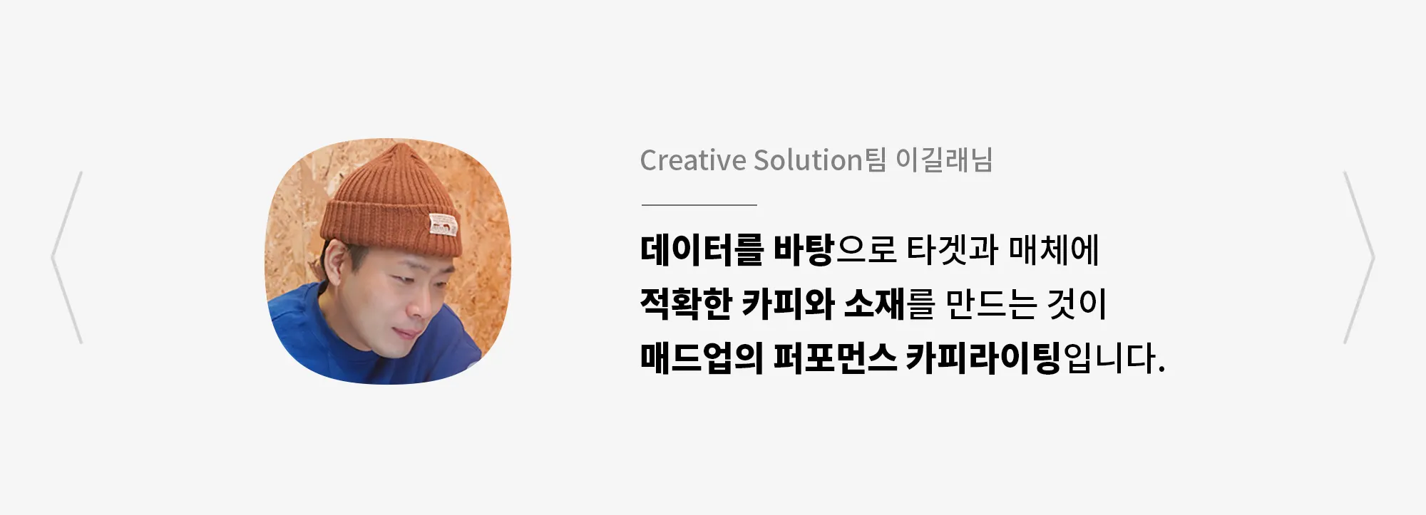 탑 티어 클라이언트들의 파트너로서 데이터, AI 기반의 퍼포먼스 마케팅을 진행하고, 그를 통해 쌓아온 노하우를 바탕으로 디지털 마케팅 AI 에이전트 ‘레버 엑스퍼트LEVER Xpert’를 개발하고 있습니다. 그리고 지금, 매드업만의 브랜드 밸류를 만들기 위한 새로운 단계로 도약하려고 합니다.