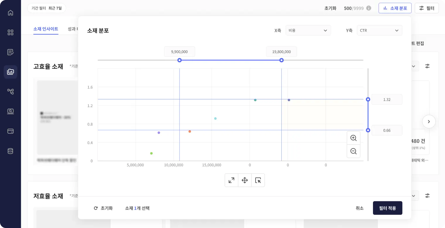 Xpert의 자동화된 소재 레이블링을 통해 해당 소재의 소구점이 무엇인지를 맵핑하고, 어떤 소구점을 가진 소재가 가장 성과가 좋은지를 시각화해서 보여줍니다. 어떤 소구점이 우리의 고객한테 가장 잘 워킹하는지를 판단할 수도 있고, 반대로 성과가 좋지 않은 소재들의 경우엔 고객 여정을 점검하거나 랜딩 페이지를 수정하는 등 구체적인 후속 액션을 도출할 수 있는 것이죠.