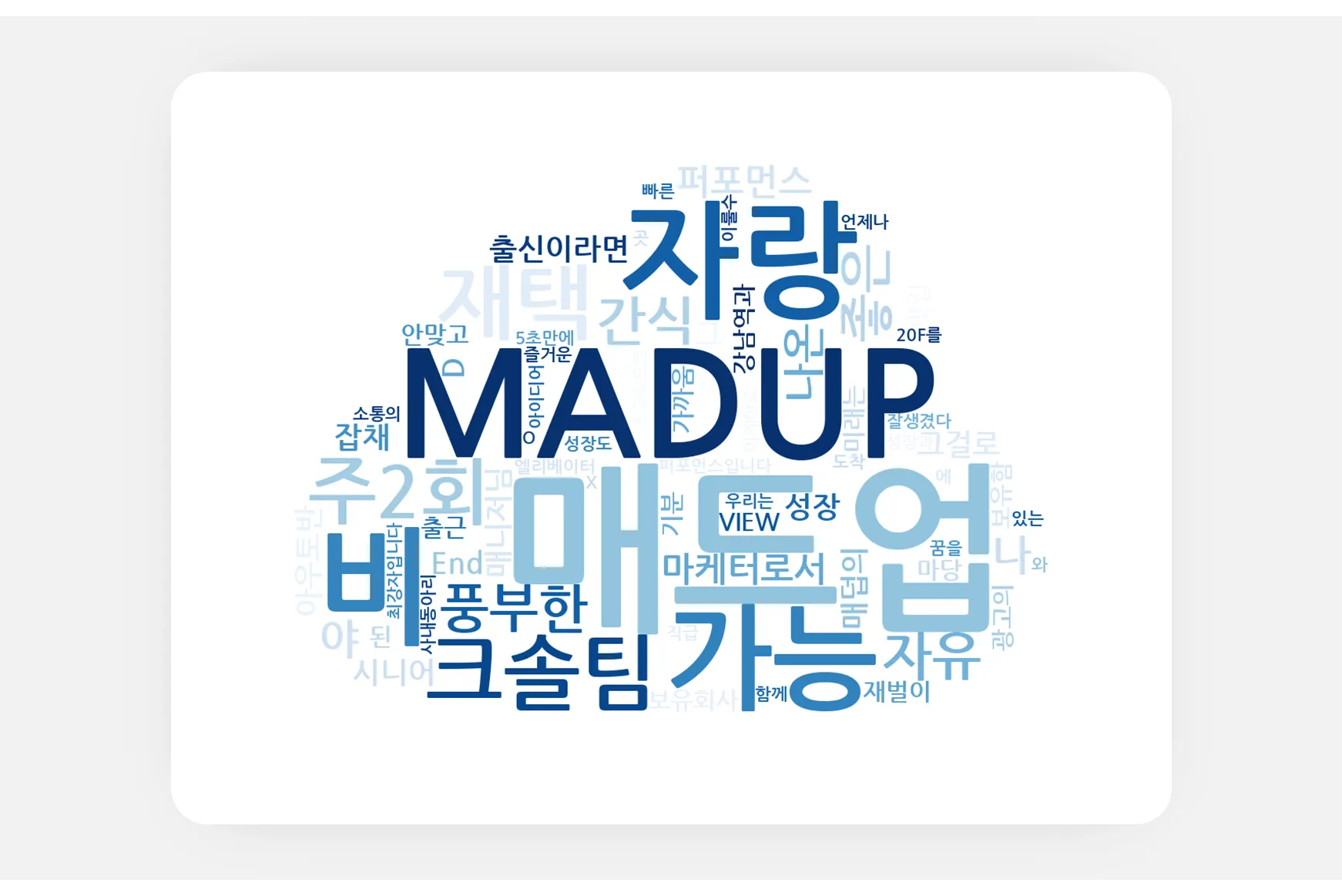 매드러너분들이 적어주신 매드업의 자랑거리를 키워드로 한번 뽑아보았는데요. 주 2회 재택, 사내 동아리, 간식 등 매드업의 복리후생에 관한 이야기들도 많이 있었지만 자유로움, 성장 등 매드업이 추구하는 문화에 대한 이야기도 많이 있다는 걸 알 수 있었어요.