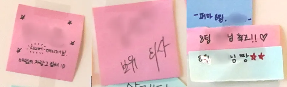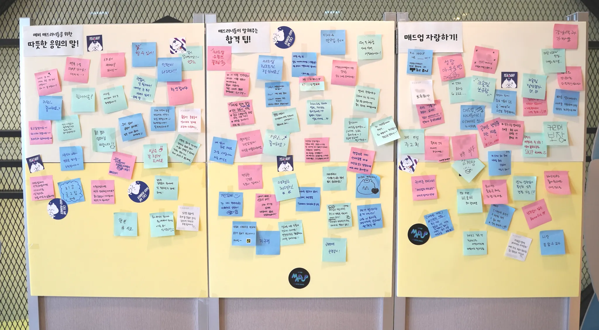 그리고 단연 눈에 띄었던 건 팀원의 이름이 적힌 포스트잇들이었습니다. 요새 말하는 ‘주접멘트’라고도 볼 수 있겠지만, “최고의 복지는 동료”라는 매드업의 굳은 믿음이 드러난 것 같아 기쁜 마음이었습니다.