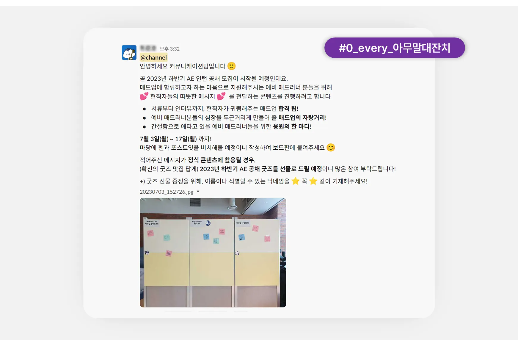 그렇게 저희는 이 말을 시작으로 매드업 슬랙의 [아무말대잔치] 채널을 통해 매드러너분들께 작은 요청 하나를 드리게 되었습니다.