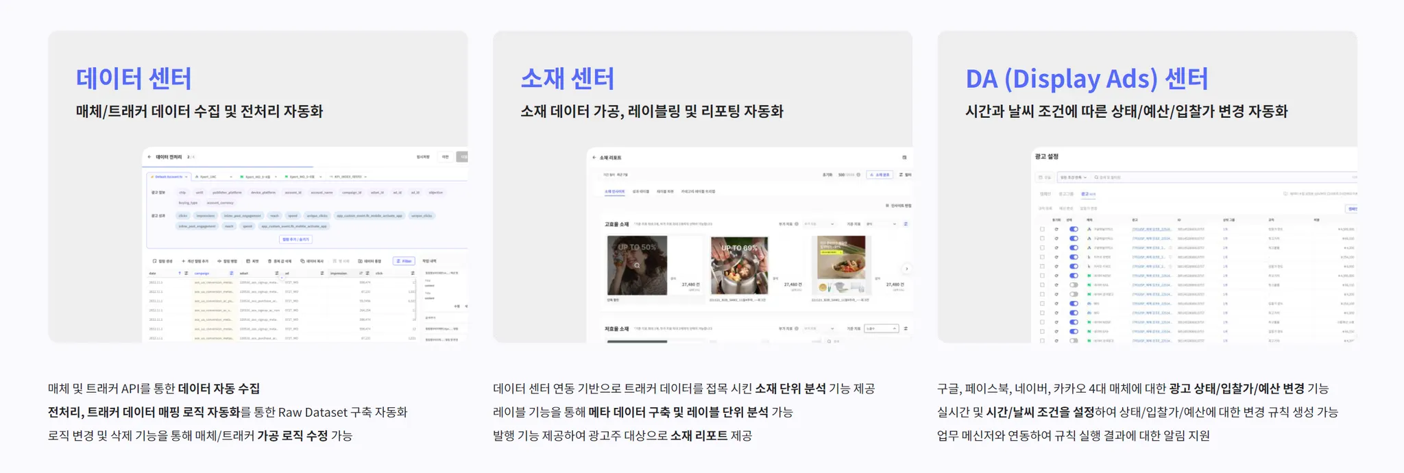 데이터 센터는 성과 데이터 수집 / 데이터 ETL 을 통해 광고 성과를 특정 룰에 따라 리포트를 자동으로 생성해 주며, 소재 센터와 DA 센터가 필요로 하는 리포트를 생성해 지원합니다.