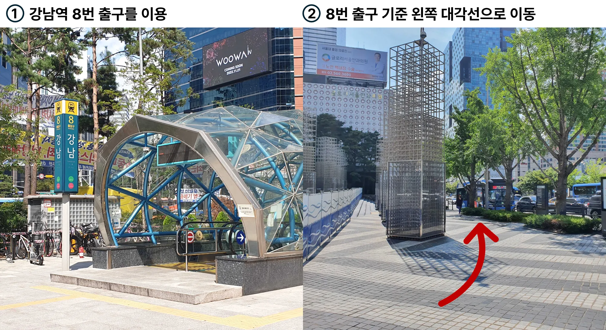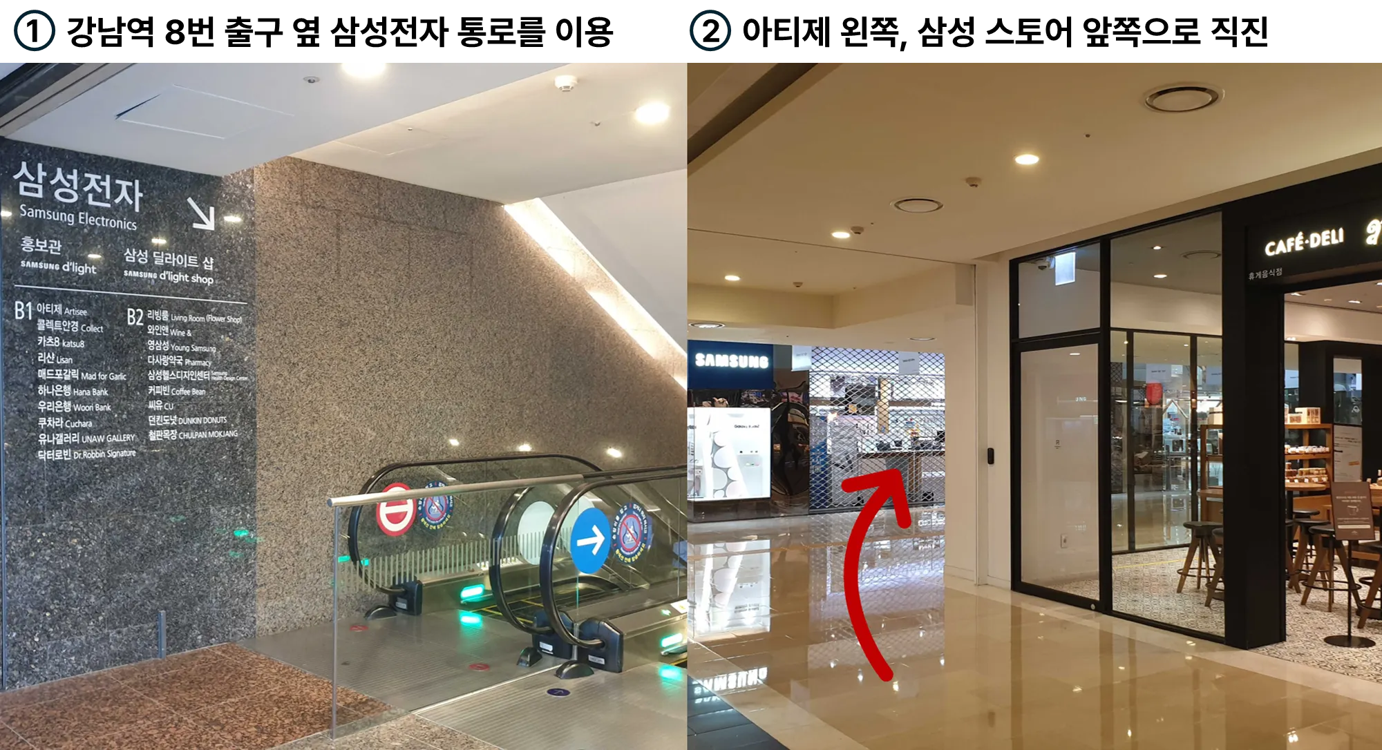 지하철에서 하차 후 강남역 8번 출구 바로 옆 위치한 삼성전자 지하 통로를 이용해주세요