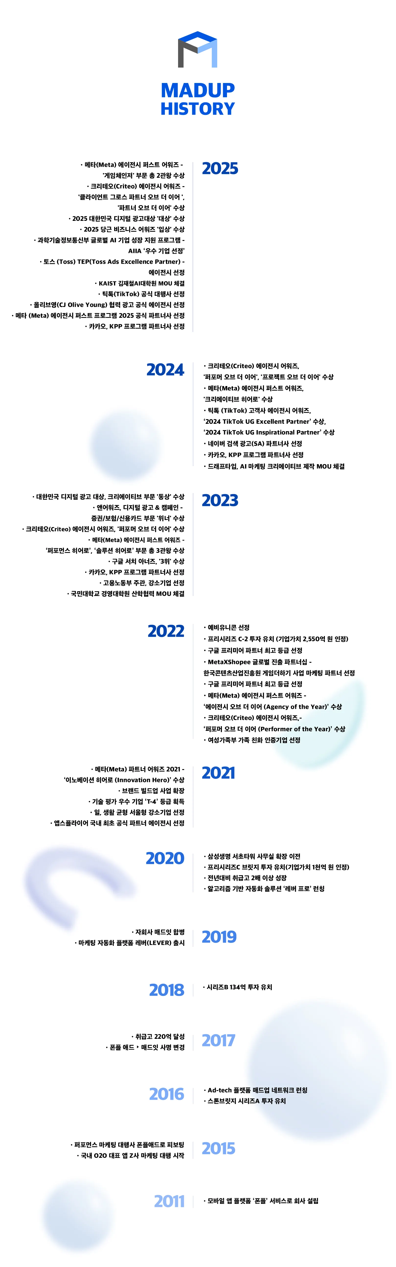 디지털 광고부터 자동화 플랫폼, 알고리즘 개발까지 매드업은 데이터 경쟁력을 기반으로 디지털 마케팅 시장을 대표하는 AI 마케팅 컴퍼니로 성장하고 있습니다.