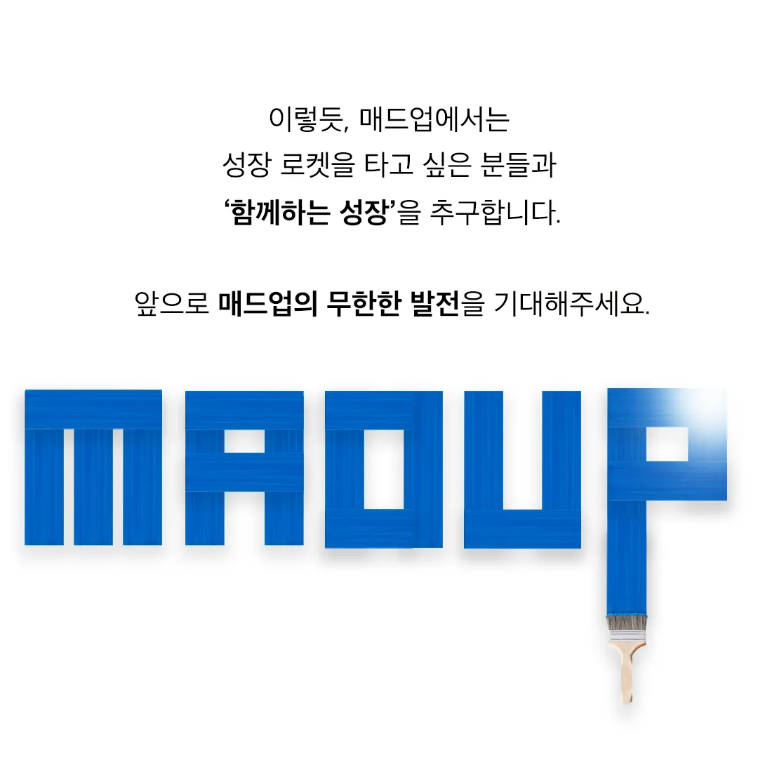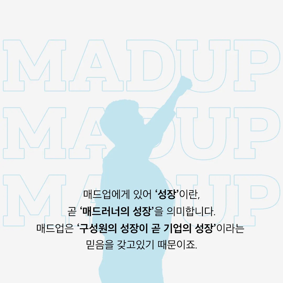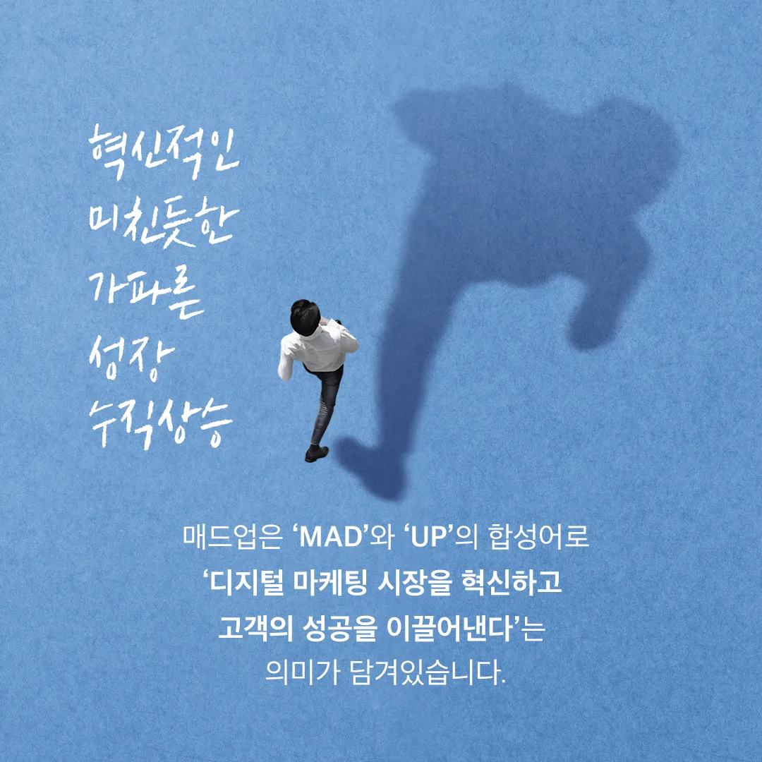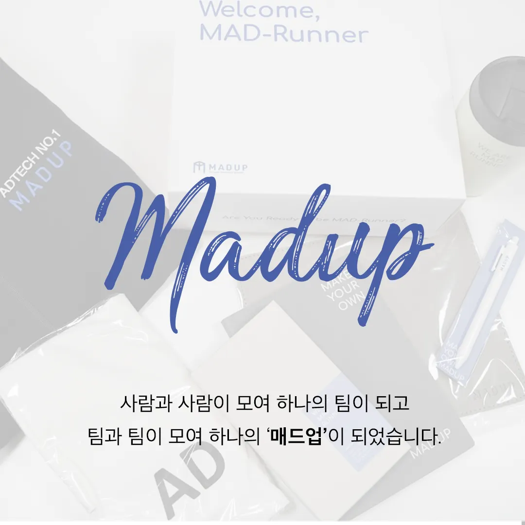 매드업의 구성원들은 스스로를 ‘매드러너Mad Runner’라고 칭합니다. 매일 빠르게 변화하는 디지털 마케팅 시장에서 모든 매드러너들은 개인의 성장과 클라이언트의 성장을 위해 달립니다.