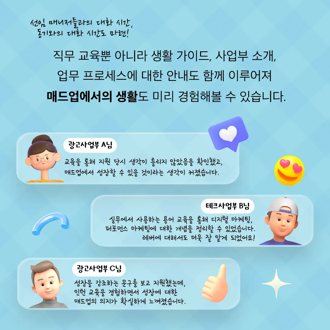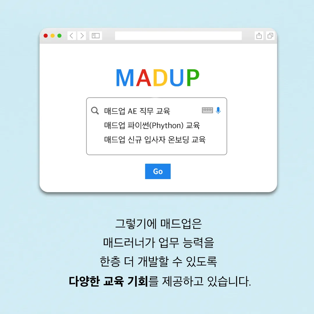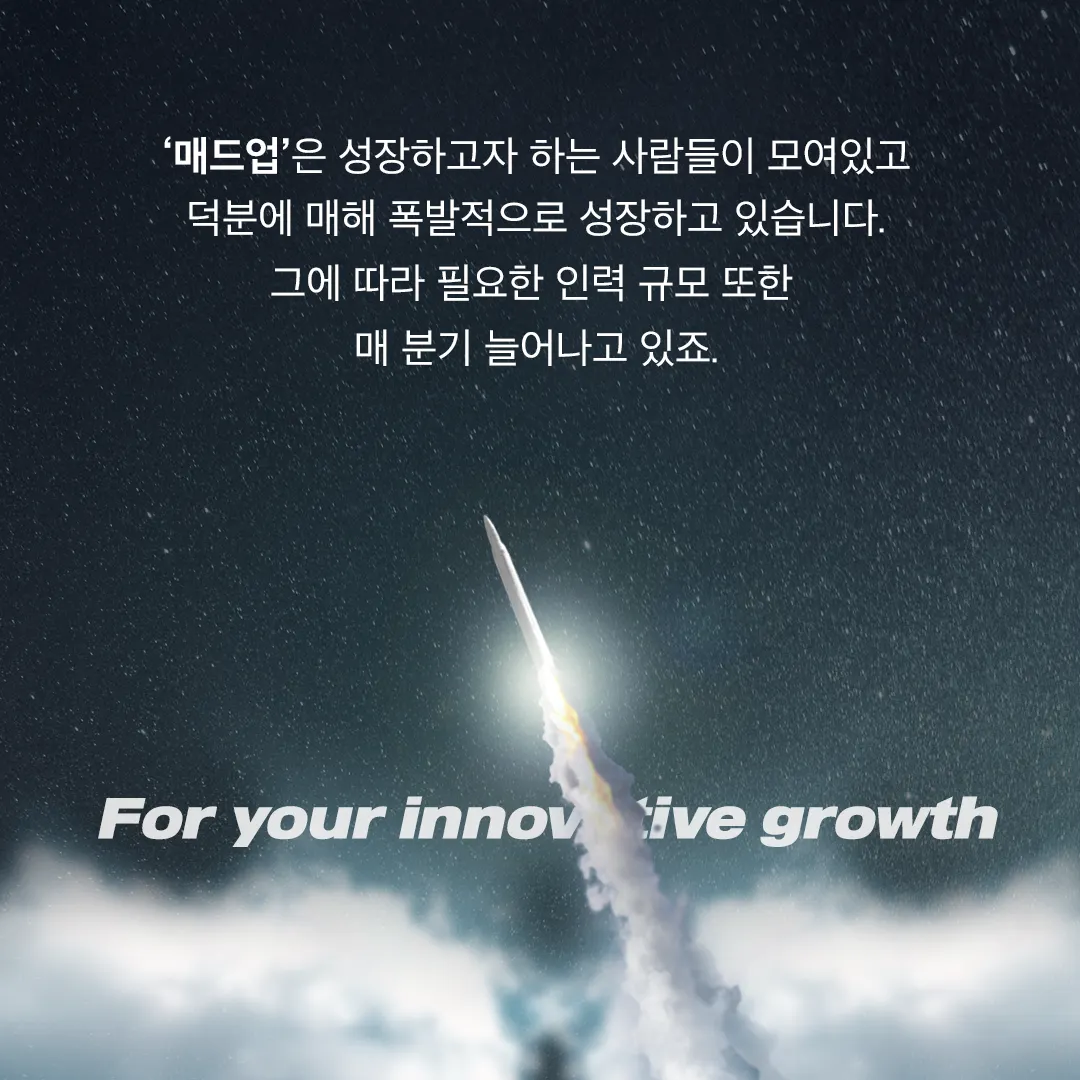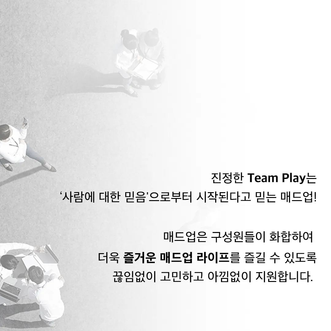 매드업의 구성원들은 스스로를 ‘매드러너Mad Runner’라고 칭합니다. 매일 빠르게 변화하는 디지털 마케팅 시장에서 모든 매드러너들은 개인의 성장과 클라이언트의 성장을 위해 달립니다.