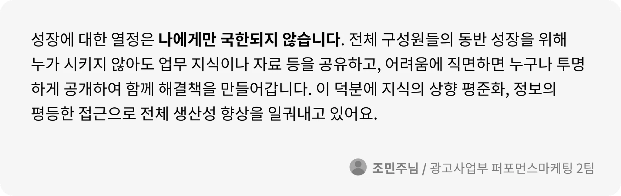 우리는 모두의 생산성 향상을 위해, 자발적인 참여와 적극적인 공유의 가치를 중시합니다.